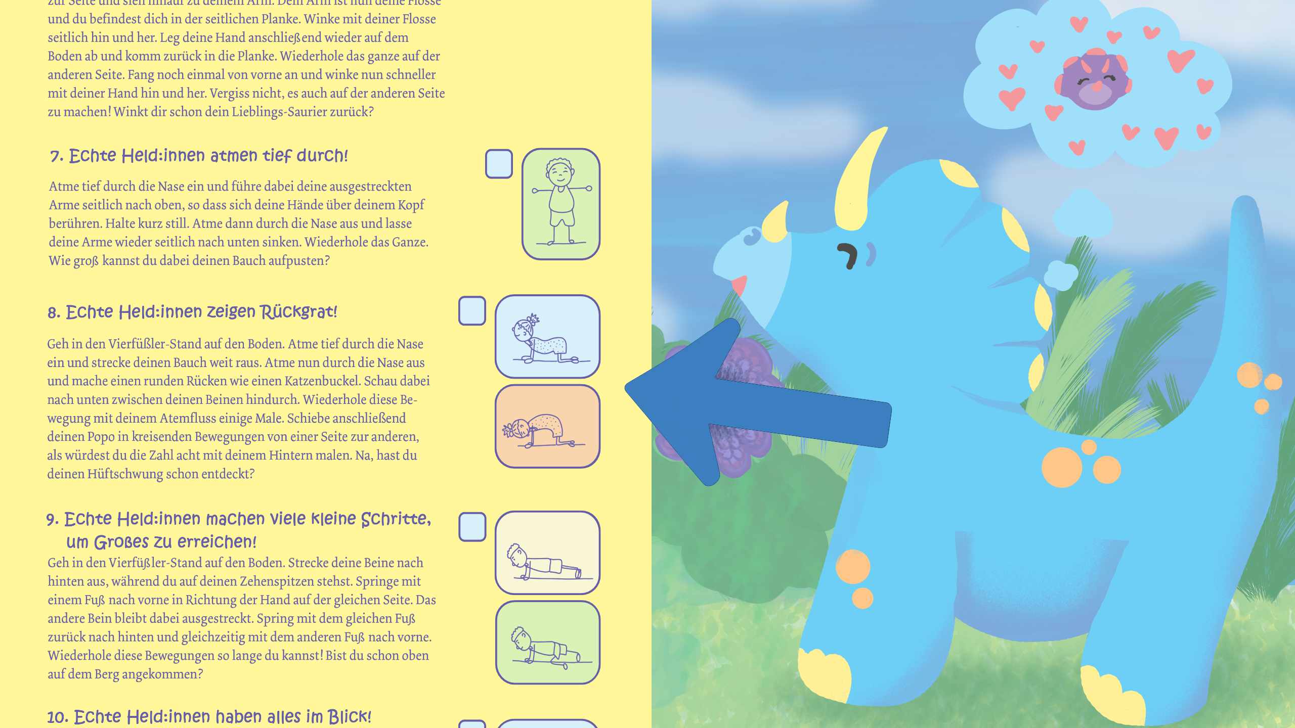 Das Besondere: Das Buch lädt Kinder nicht nur zum Lesen, sondern auch zum Mitmachen ein! 24 spielerische Held:innen-Prüfungen – von Yoga-Posen über Tanz und Atemübungen bis hin zum fröhlichen „Dino in der Krippe“-Song – fördern Bewegung, Konzentration und Kreativität.